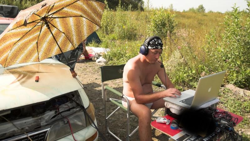 The irony here is that regardless of the fancy equipment, it comes down to persons skill; all those fancy ham shacks in the link above are nice, but it comes down to getting the message through, which this casual fellow in the picture is doing just fine.
