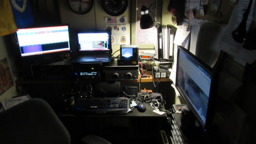 Owing to the need for a central point for a power supply, antenna feed lines, grounding cables, and centralized operation, most amateur radio operators create a single space where all the base communications are installed together. In radio code this is called your QTH, your station’s location. It’s also called a ham shack or if you want to get nuts, the Community Communications Command and Control Center, “C5“. The major components are these: